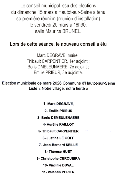 Le conseil municipal issu des élections du dimanche 15 mars à Hautot-sur-Seine a tenu sa première réunion (réunion d’installation) le vendredi 20 mars à 18h30, salle Maurice BRUNEL.