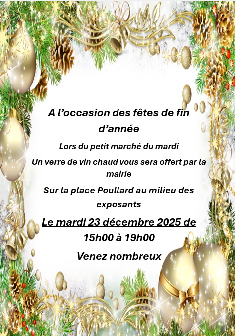 - le mardi 23 décembre de 15h00 à 19h00 le verre de vin chaud offert par la mairie sur la place Poullard lors du petit marché du mardi.